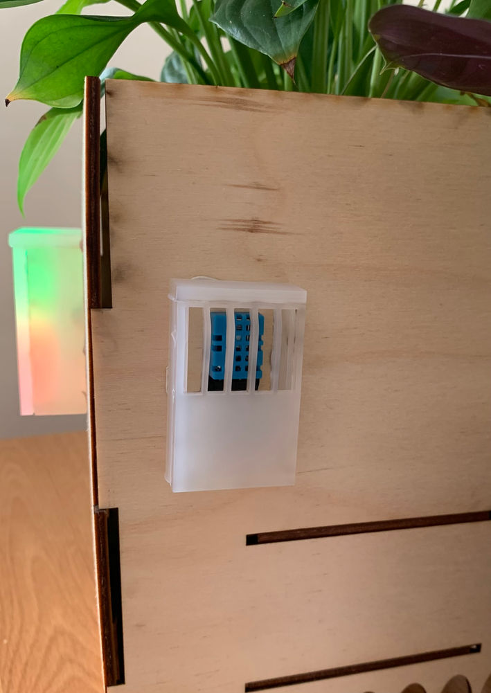 The Neopixel was able to showcase the temperature and humidity conditions through ambient awareness. For instance, a blue colour would indicate that the humidity was too high and a red would signal that it was too hot. This visual feedback provided users with intuitive and easily understandable information about the environment inside the house.